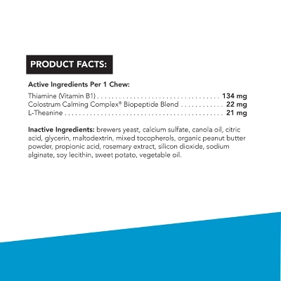 When pets can’t adapt to stress, it can lead to hyperactivity, abnormal urine marking, excessive scratching, trembling, pacing, excessive panting and destructive or aggressive behavior. The ingredients in Composure™ work synergistically to support relaxation without changing your dog’s personality or energy levels. The Colostrum Calming Complex™ Biopeptide Blend supports stress reduction and cognitive function; L-Theanine helps the body produce other amino acids to bring specific neurotransmitters back into balance; and B vitamins (thiamine) affect the central nervous system to help calm anxious animals.Our ingredients are well researched and recognized for their natural ability to support balanced behavior. When combined in our formula, they provide a calming effect to support a relaxed state without causing drowsiness or impaired motor skills. Composure™ is easily administered in a tasty chicken liver flavored soft chew and can be used as a daily supplement or, as needed in stressful situations.Now available in a tasty peanut butter-flavored bite-sized chew that your dog will love.