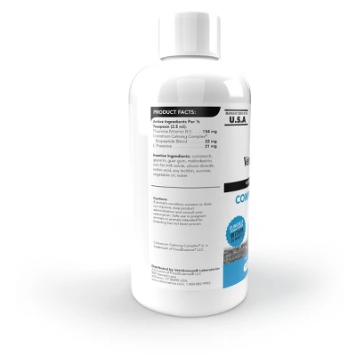 Composure™ Max Liquid is recommended for pets exposed to increased environmental stressors, such as traveling, boarding, thunderstorms, trips to the vet, grooming, and other stressful situations. This formula contains three main ingredients that work together to support calming and relaxation without affecting the pet’s energy levels or personality. The C3™ colostrum calming complex supports stress reduction and cognitive function; L-Theanine helps the body produce other amino acids to bring certain neurotransmitters back into balance; and B vitamins (thiamine) affect the central nervous system to help calm anxious animals.