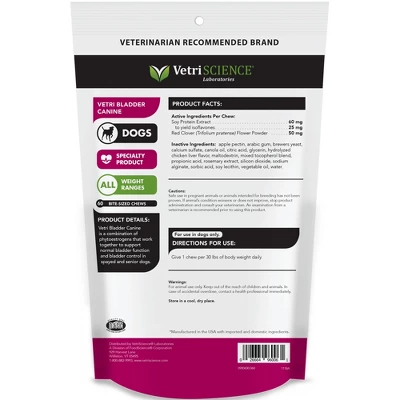 Vetri Bladder Canine is a combination of phytoestrogens that work together to support normal bladder function and bladder control in spayed and senior dogs. This product contains soy protein extract, which is a source of isoflavones. Isoflavones are phytoestrogens (plant based hormones) that help maintain normal bladder muscle tone lost after spaying or during the aging process. Red Clover Flower Powder is considered to be one of the richest sources of isoflavones available. The estrogen-like effect of red clover isoflavones may attach to estrogen receptors throughout the body. Specifically, they may attach to those receptors in the bladder that will support normal urinary control.