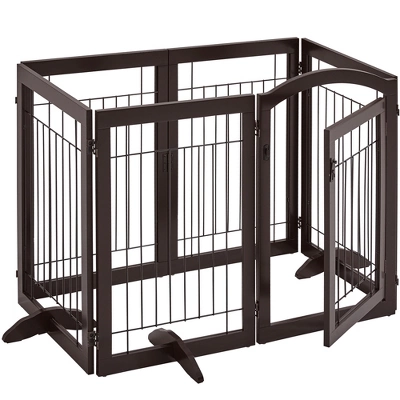- Constructed from a durable MDF and metal, keep your dog, puppy, or other pets confined while you are away. This pet gate is a safe and efficient way to limit your pets while offering a decorative and handsome touch to your home. The pet gate is connected with 6 separate panels and secured with sturdy hinges allowing the gate to fold out into a Z-shape or rectangle configuration. Protective footpads and EVA foam protect the floor from scratching and uneven the floor. Suitable doorways, entryways, halls, bedrooms, and staircases.