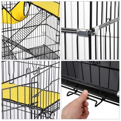 - This 4-tier cat cage has a well-built structure made of harmless finished iron and measured 31.5x22x48.4″(LxWxH). As a detail-oriented pet cage, it boasts a sturdy staircase, quality hammock/bedding, easy-to-clean litter tray at the bottom, secured cage lock and brake casters, which makes it an ideal choice of rolling cage for pet parents. Also, the cage applies user-friendly construction and comes along with easy-to-read worry-free assembly instructions in the package.